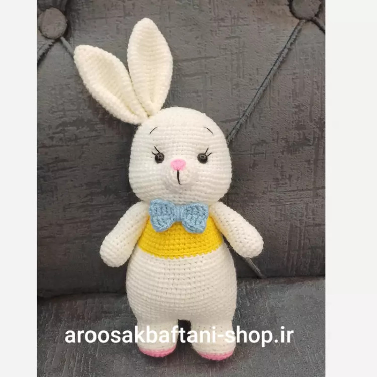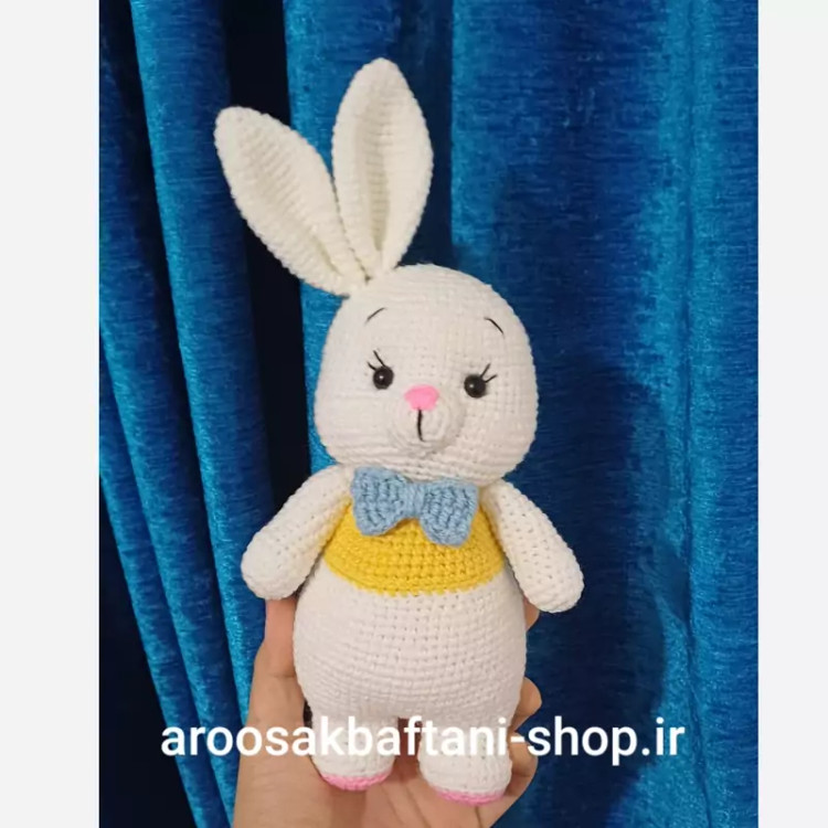 عروسک خرگوش تپلی بافتنی باگوش 26 سانت بافت بارنگ دلخواه شما